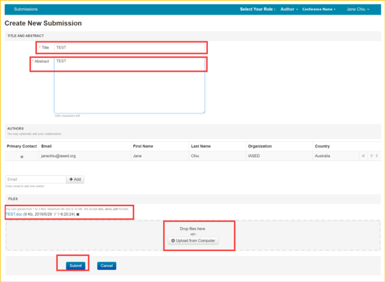 II. Please fill in your “paper title” and “abstract”, and by clicking the button ‘submit’ to upload the files(doc or PDF)